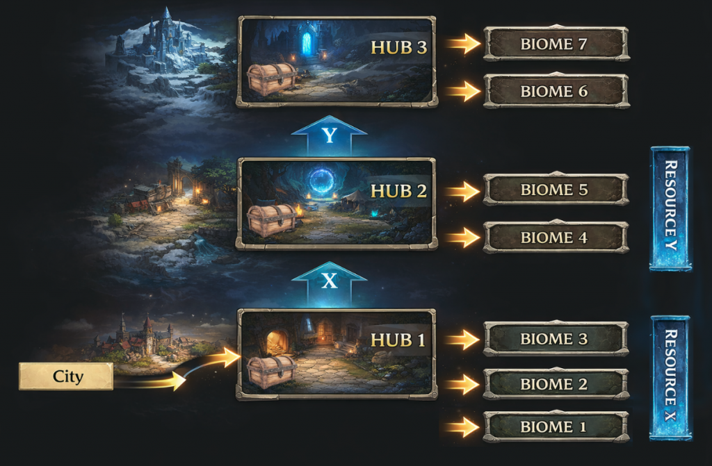 In terms of discriminant, the one that mattered the most for me was “The candidate that produces the highest tempo control and strategic access”. This pushed me towards a Hub system (solution also widely used in our genre as well) but with a twist: 3 Hubs, stacked one on top of another. Each hub gives the player access to 2 to 3 biomes, but also to the next Hub. Accessing this next Hub requires the player to spend resources found in the current Hub. Coupled with a “Persistent Stash/Chest” (another design pattern), letting players bypass the requirements, I created what I believe is a great solution to my constraint, with very acceptable costs: players can rapidly access Hub #3 by being smart, strategic, and displaying mastery in the previous ones, I can easily hard gate the access to these Biomes for Narrative purpose, and even bad players can use the Stash system to quickly bypass Hubs requirements.